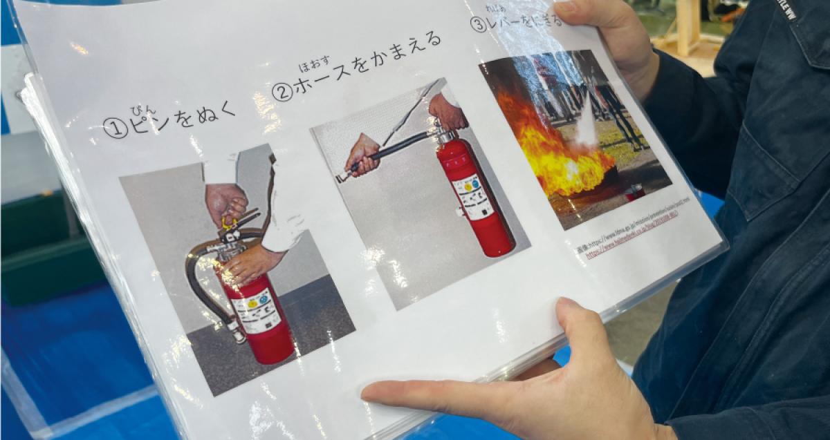 もしも火事が起きた場合、通報から消防車到着までの平均時間は約8分。火事発災から2分以内に初期消火を行うことが重要です。暮らしている地域のどこに消火器があるのか、どうやって使うのか、知っているだけでも自分と大切な家族の命を守ることに役立ちます。そのことを視覚的に分かりやすく子どもたちへ伝えるため、イラストや写真を交えたクイズ形式のレクチャー方法を考えました。